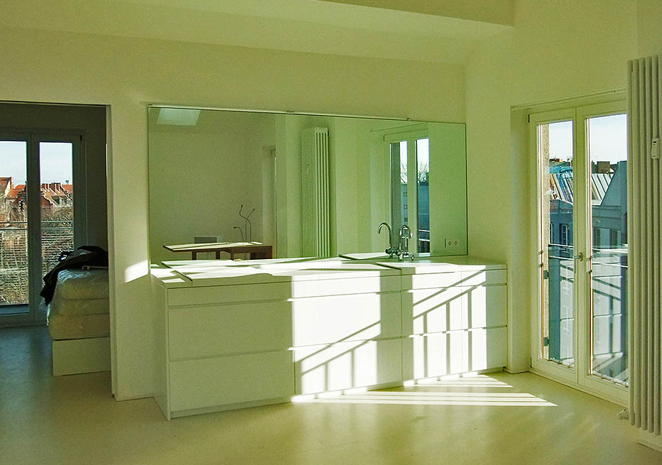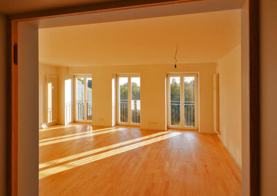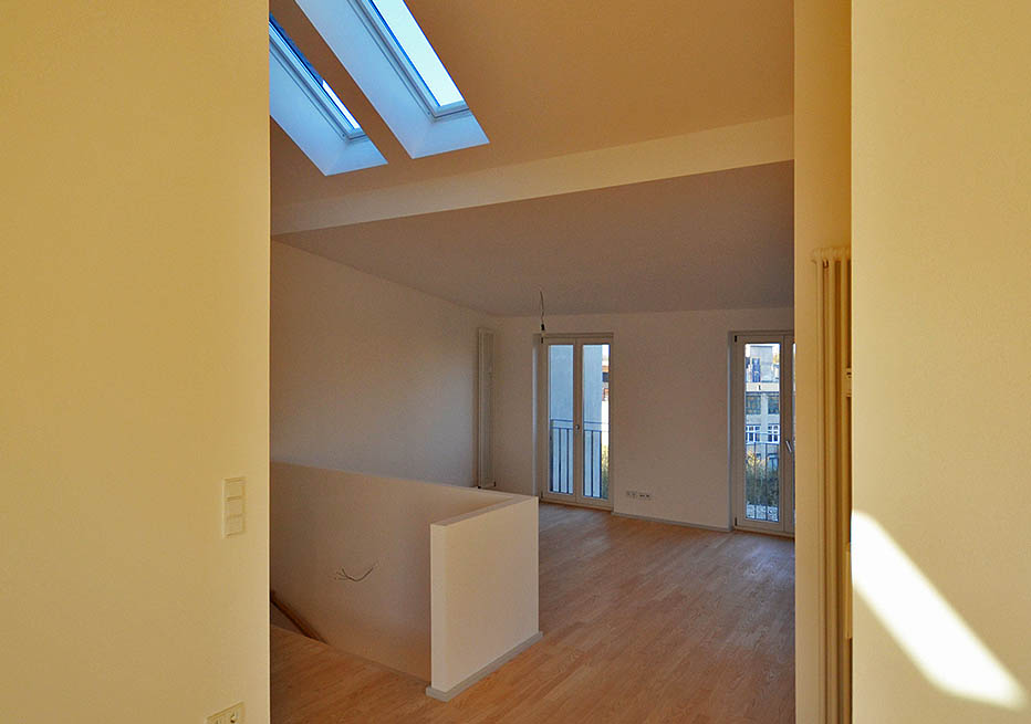 Durch den Anbau von Balkonen, die Verlängerung der vorhandenen Fenster zu „französischen Fenstern“ und neue Fensterdurchbrüche in der Giebelfassade zur Panke hin sind sehr gut belichtete Wohnflächen entstanden.