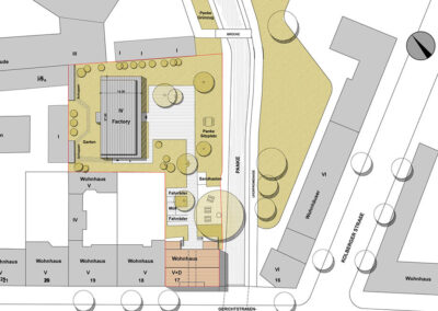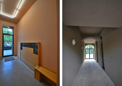 Das Erdgeschoss wurde mit einem breiten Durchgang als Zufahrt zum Garten versehen, die den Neubau „Factory“ im Garten erschließt. Ein repräsentatives Foyer mit Zugang zum Treppenhaus und zum neuen Aufzug schließt daran an.