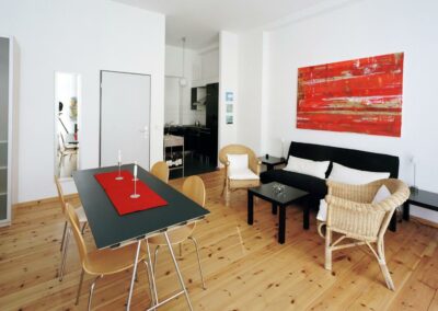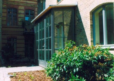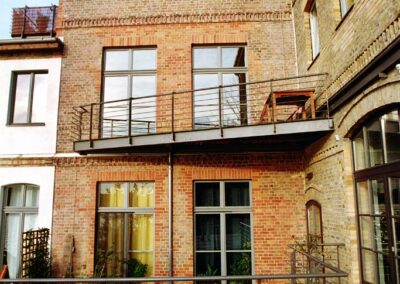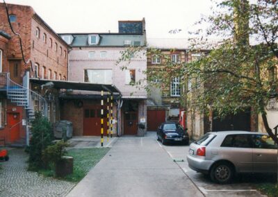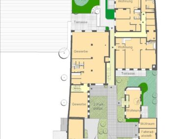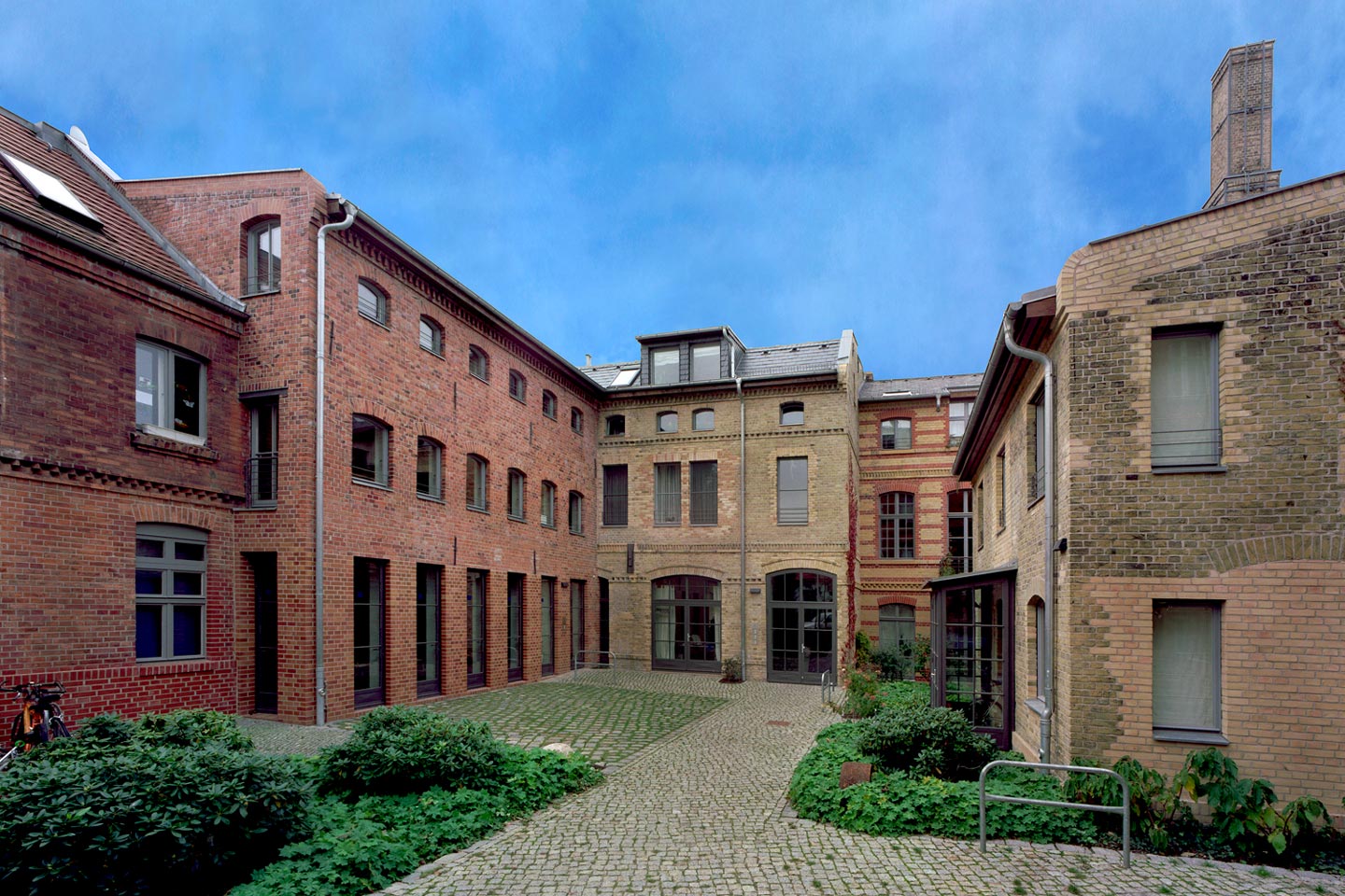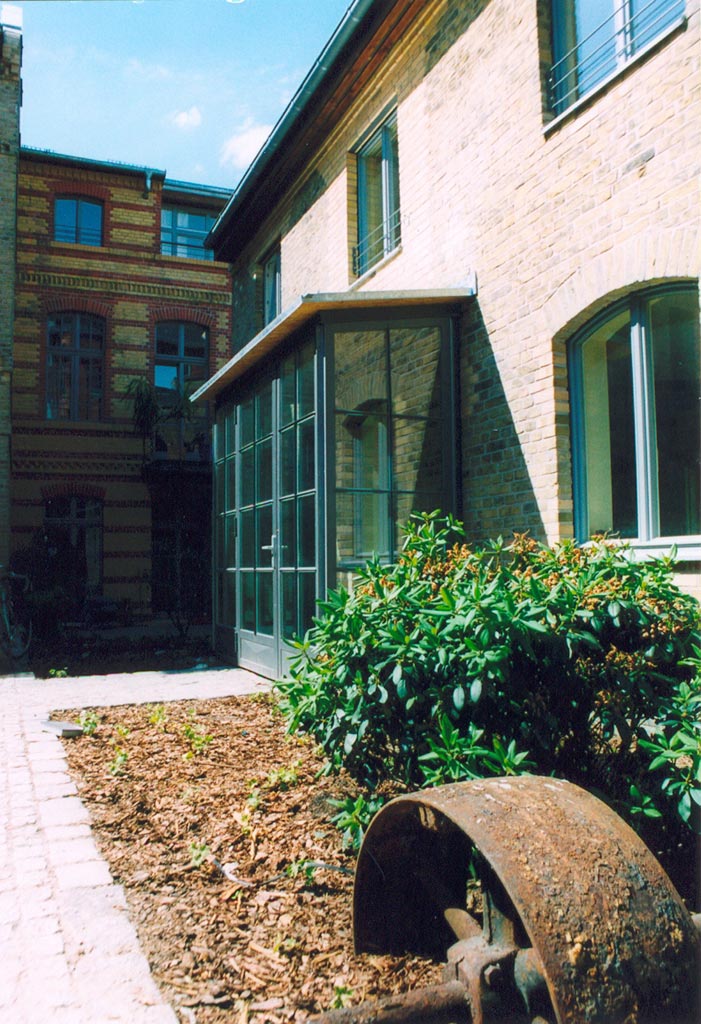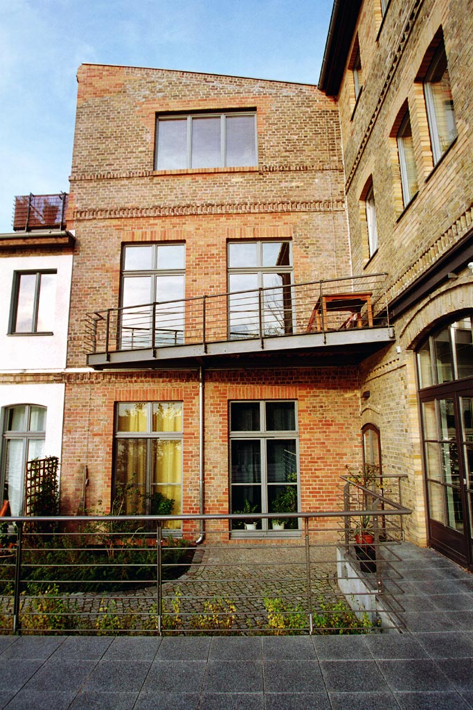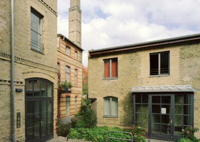 Der Einsatz neuer Materialien ist auf Stahl, Holz und Stein reduziert. Die lackierten Oberflächen sind in einer Abstufung von Grautönen gehalten, so dass die Materialfarben der Ziegel-Sichtmauerwerksfassaden und des Holzes gut zum Ausdruck kommen. Es entstanden 13 hochwertige Wohn- und Gewerbeeinheiten.