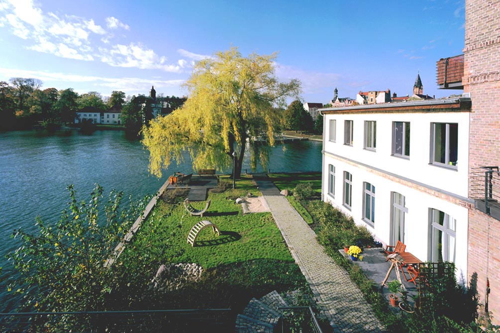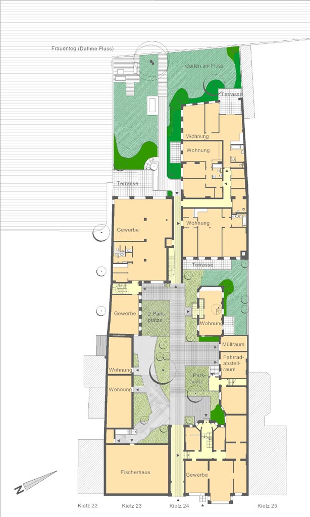 Die Gestaltung der Außenanlagen erfolgte entlang der Verbindungslinie zwischen der Straße Kietz und dem Ufer und weist damit auf den eigentlichen Ursprung der Grundstücksnutzung hin.