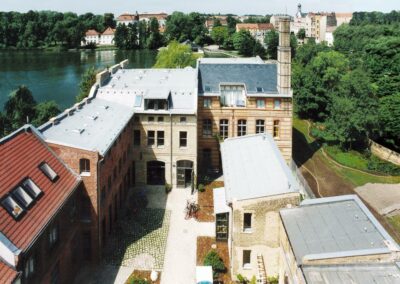 Die vorgefundene Substanz entstand zwischen 1850 und 1900 in 6 Bauabschnitten und wurde in der Folgezeit immer wieder teilweise entstellenden Umbauten unterworfen. Die sehr vernachlässigten Gebäude waren durch Anbauten, Vordächer und andere Ergänzungen in ihrer Form kaum noch erkennbar. Sie wurden wieder in eine lesbare und eindeutige Form überführt. Dabei wurde ein denkmalpflegerisches Konzept zugrunde gelegt, das sich weniger an der Rekonstruktion bestimmter Bauphasen sondern an einem behutsamen Umgang mit der Substanz unter dem Stichwort „Weiterbauen“ orientiert.