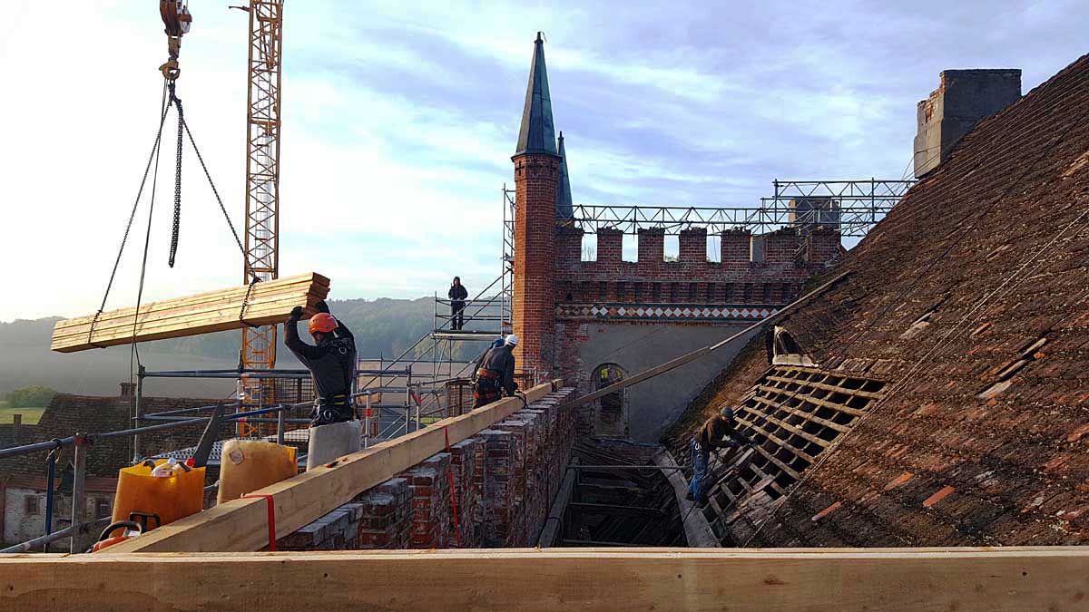 Mit den Baumaßnahmen am Schlossgebäude wurde 2018 im Rahmen der geförderten Notsicherung begonnen. Die ersten zwei Abschnitte wurden erfolgreich beendet und der 3. Bauabschnitt der Notsicherung befindet sich in der Ausführung.